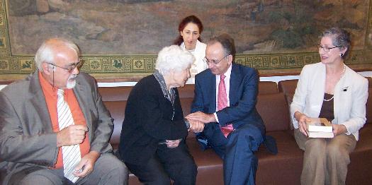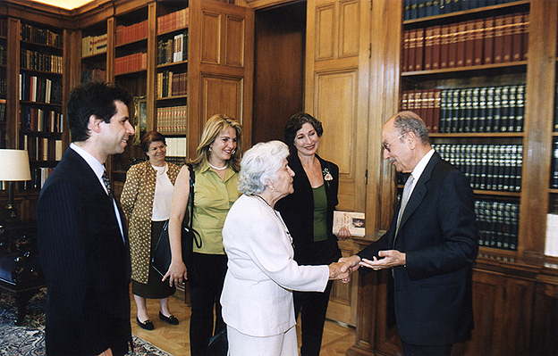 Shown here is Sano Halo shaking hands with Presiient of Greece, Kostas Stephanopoulos in his offices in Athens. Also present: Costas Govostis, publisher of: "Oute To Onoma Mou" the Greek edition of "Not Even My Name," and Marina Frangos, the translator of the Greek edition. 2002.