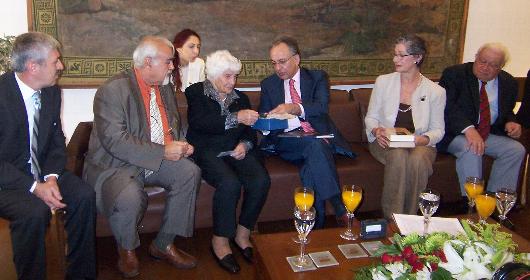 L to R. George Tsilfidis, Dimitris Tamboulidis, Sano Halo, Dimitrios Sioufas giving Sano a gift of a silver dish engraved with the Parliament building and the Greek Spiral of Life for a handle, Thea Halo, and Apostolos Apostolidis